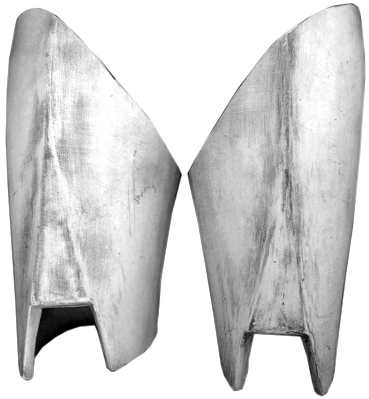 - Front of thigh armor has a flat triangular area near the knee with a notch cut out for the knee armor.
