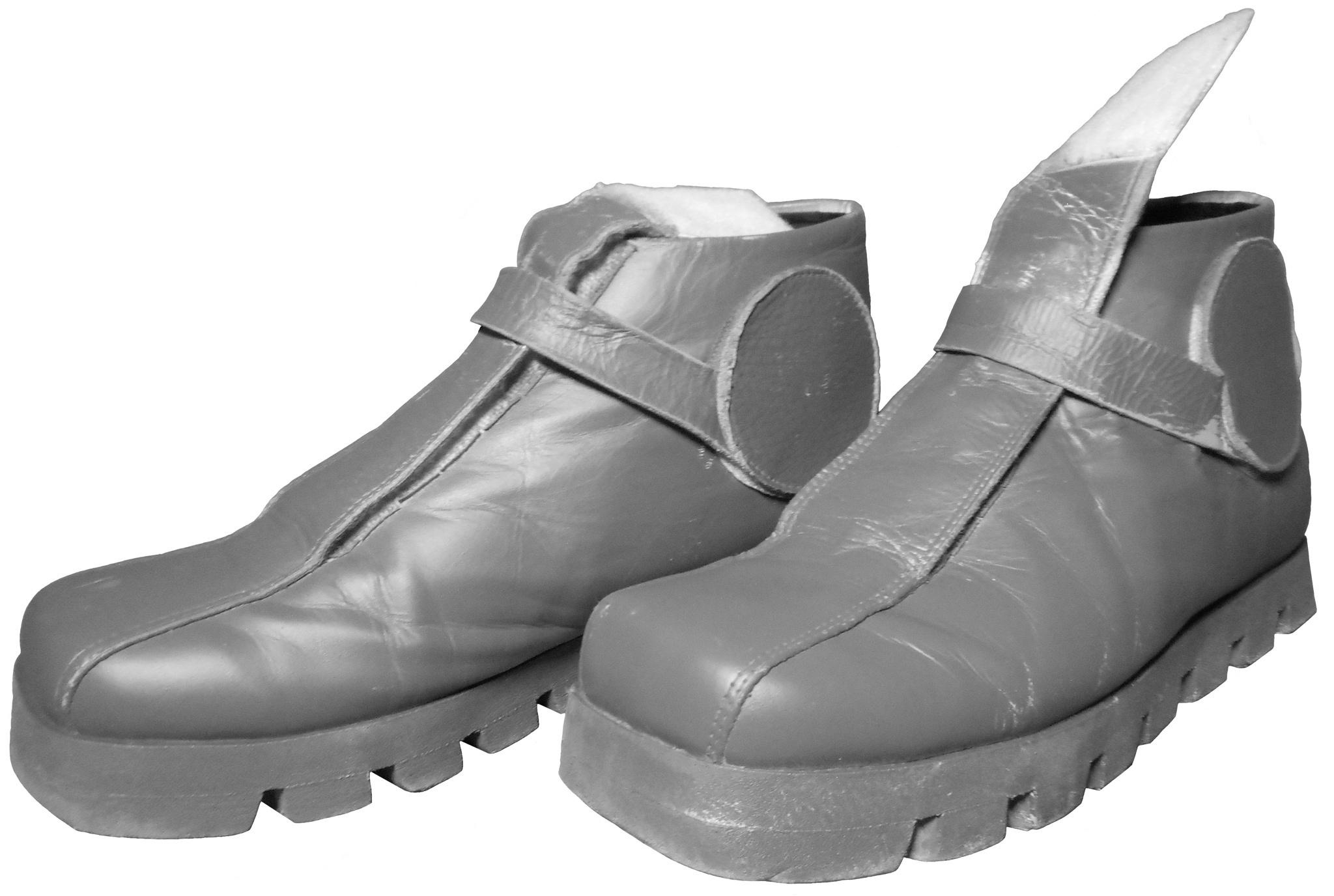 - The boots have flat soles with a notched tread.