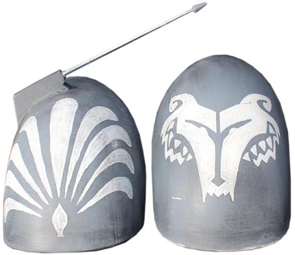 - The outside of each bicep is painted with a blue-gray, inverted 4 point design.