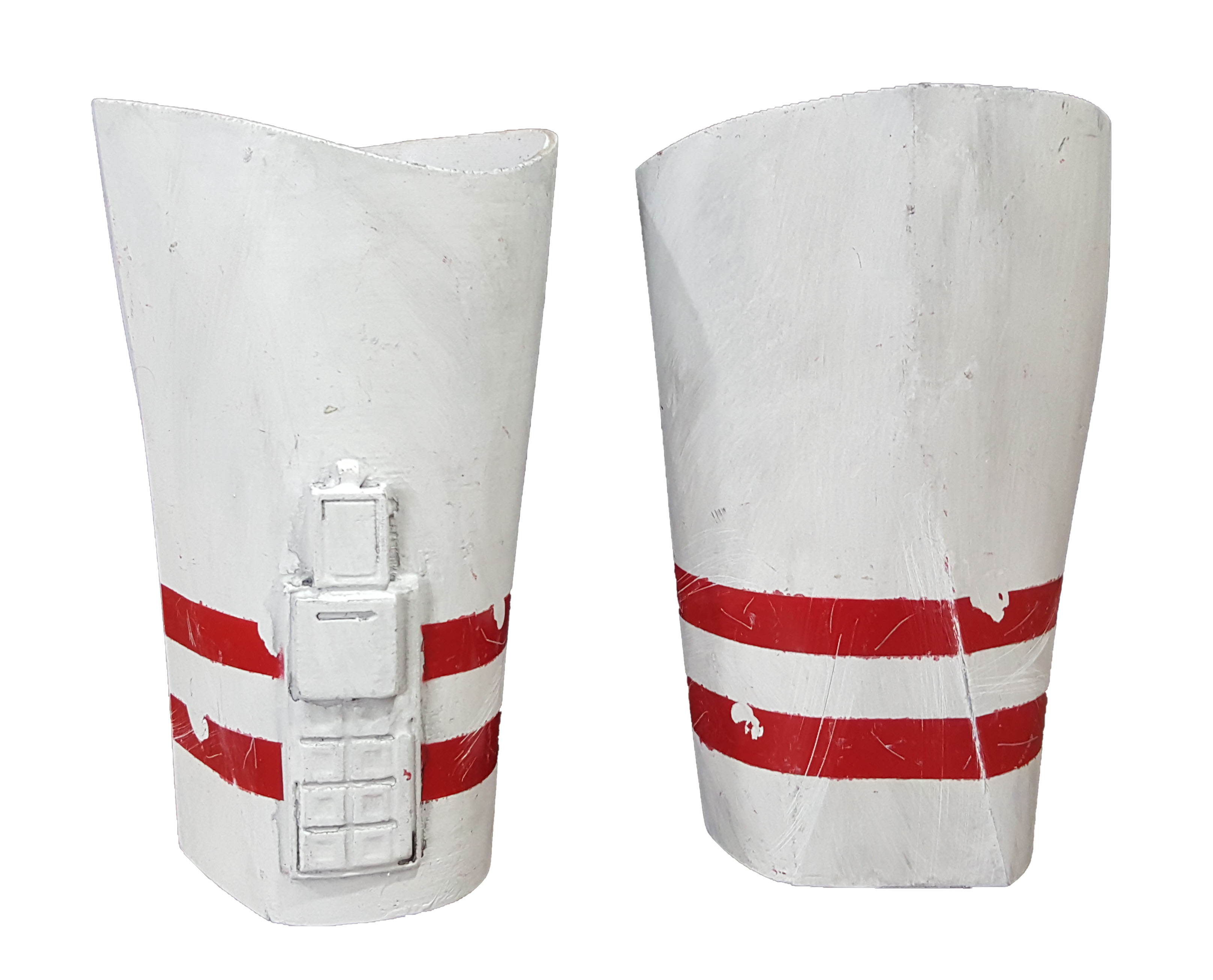 - Armor has two parallel dashed detail slots on each outside edge of elbow at the strap connection.