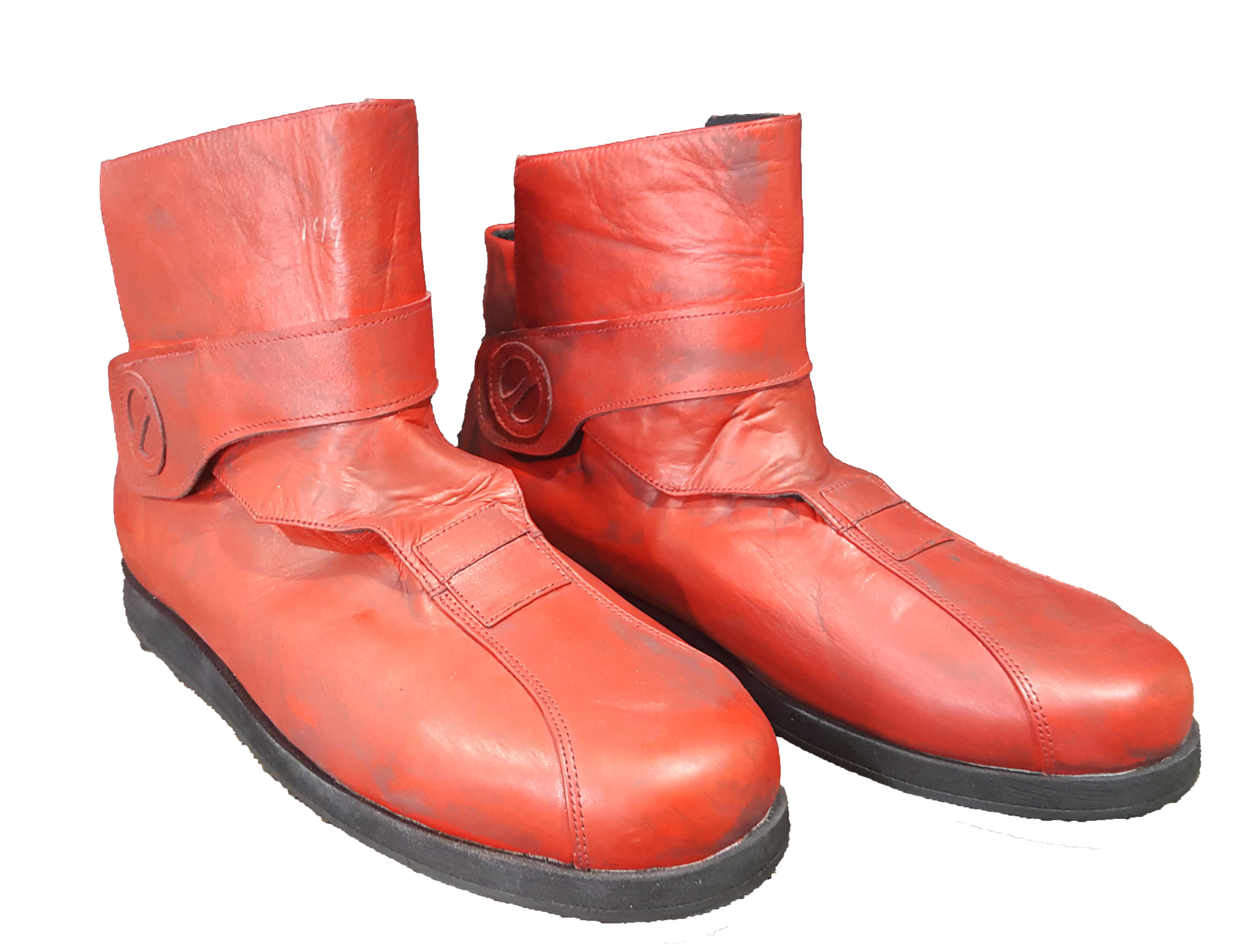 - The Boots are red, ankle high or tall enough to cover the ankle and eliminate any black undersuit visible at the ankle.