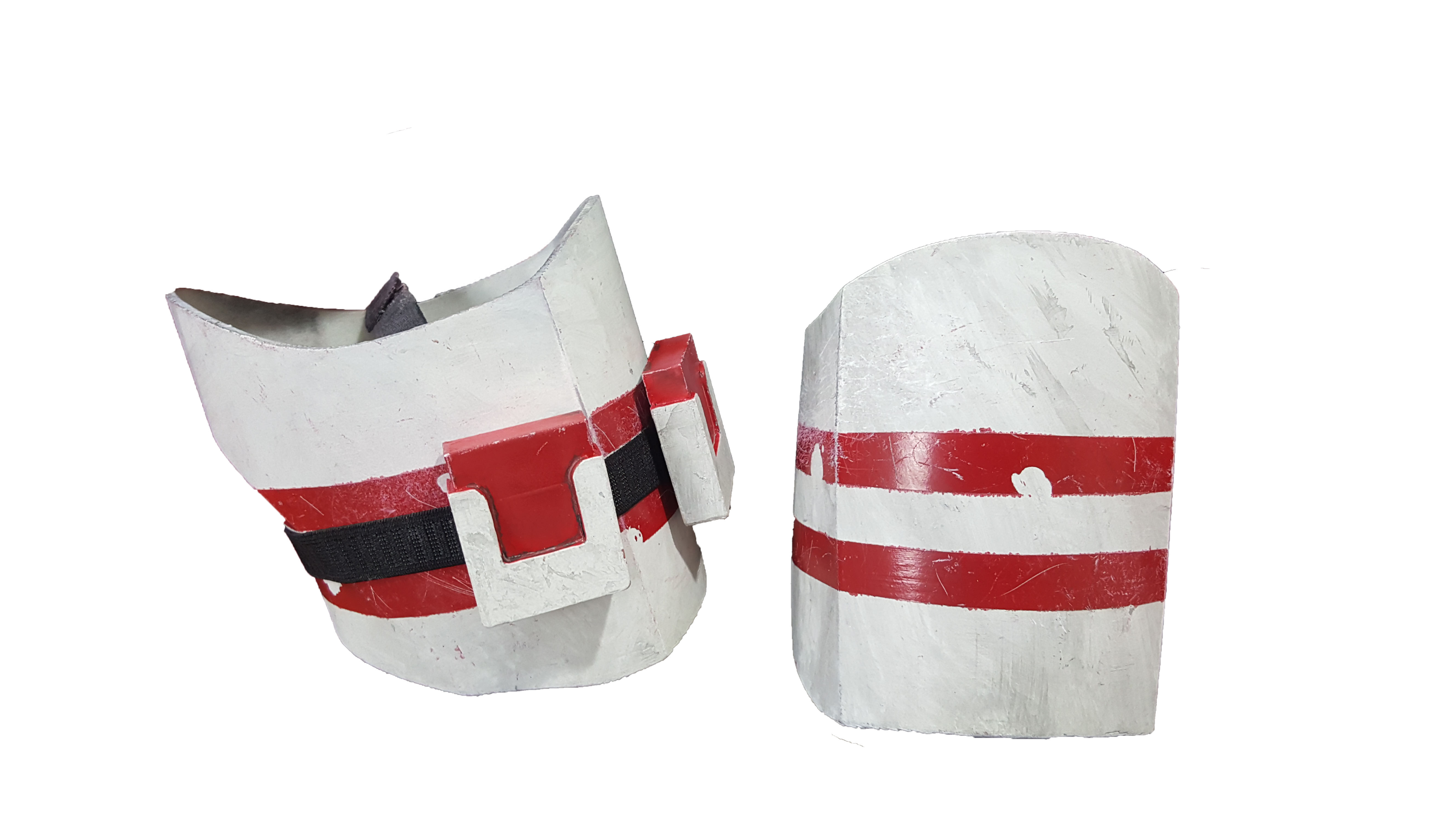 - The front of the armor has a triangular detail at the top of the leg and a hard ridge line down the front of the shin.