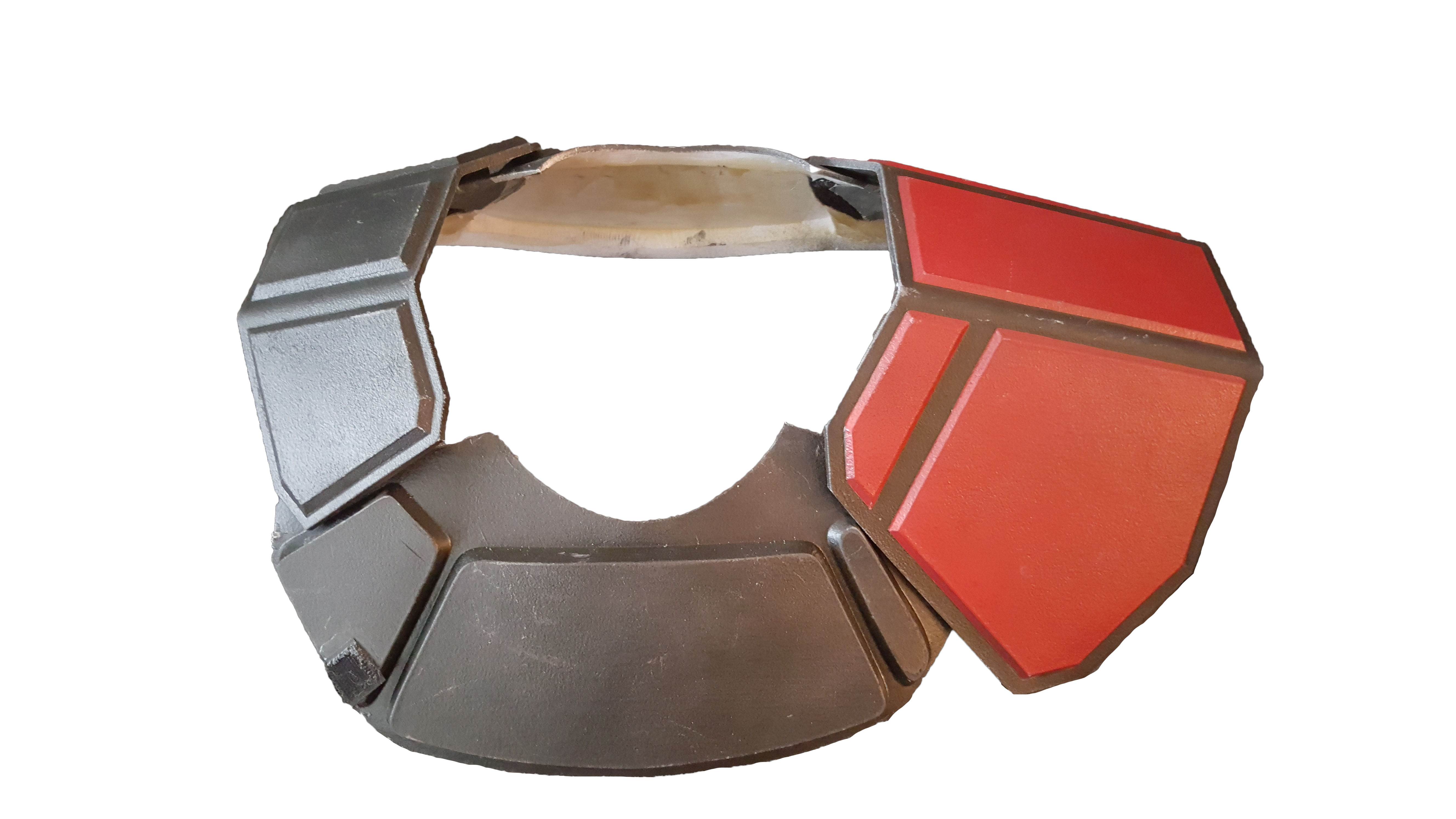 - Pauldron has a black leather or vinyl base with wedge shaped panel details.