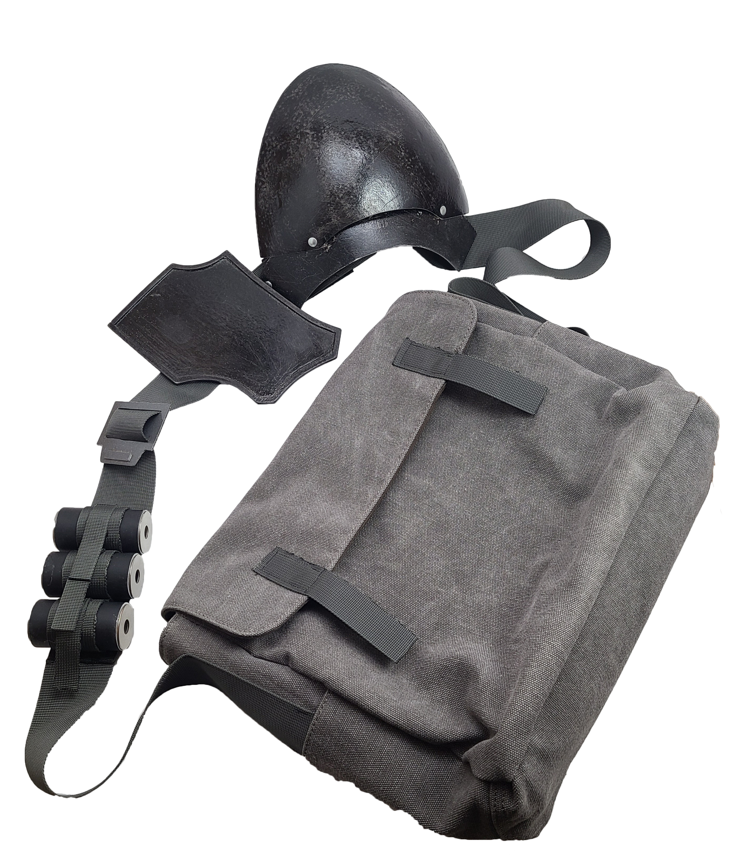 - There are three cylindrical canisters attached to the front of the strap via fabric loops.