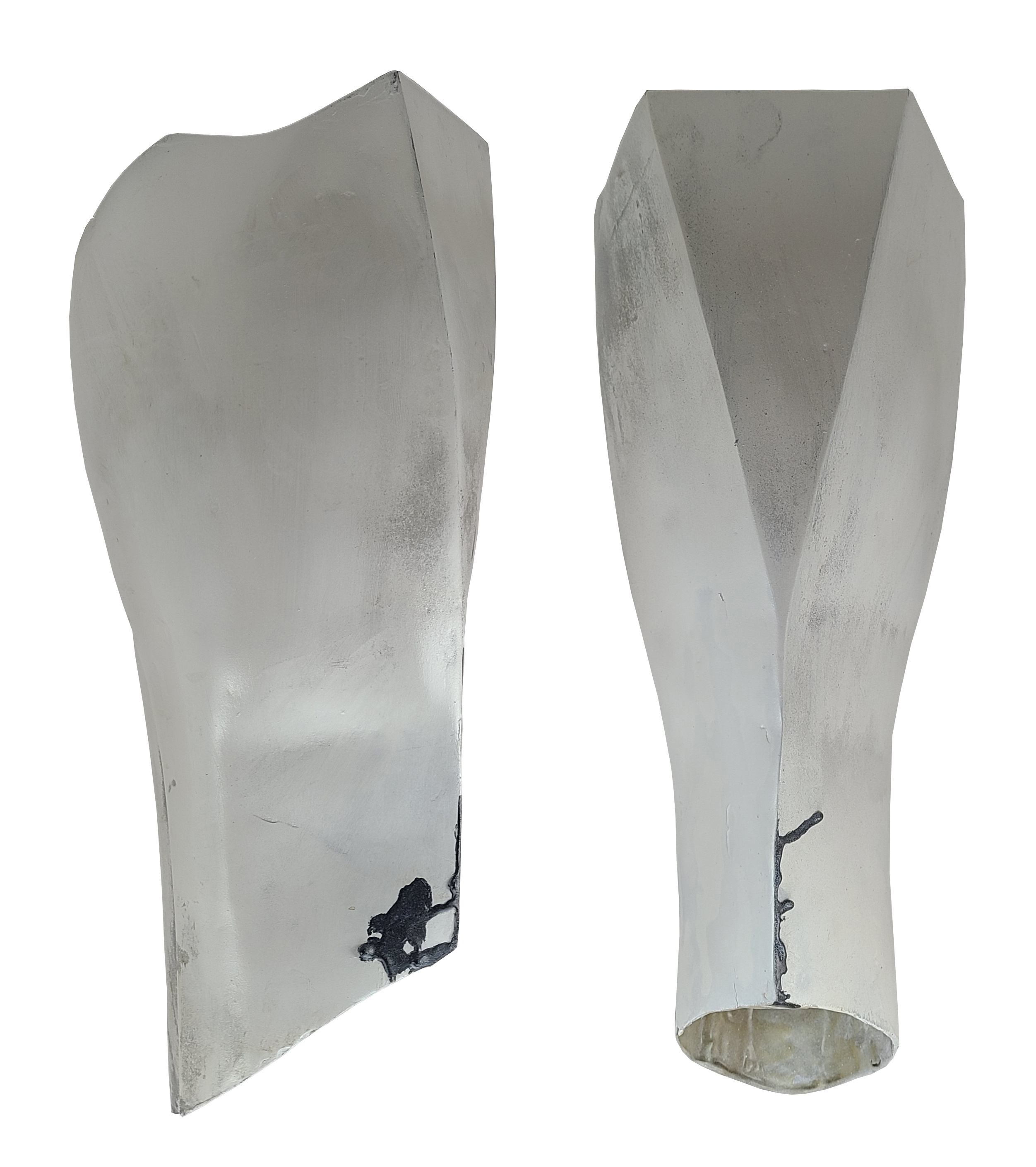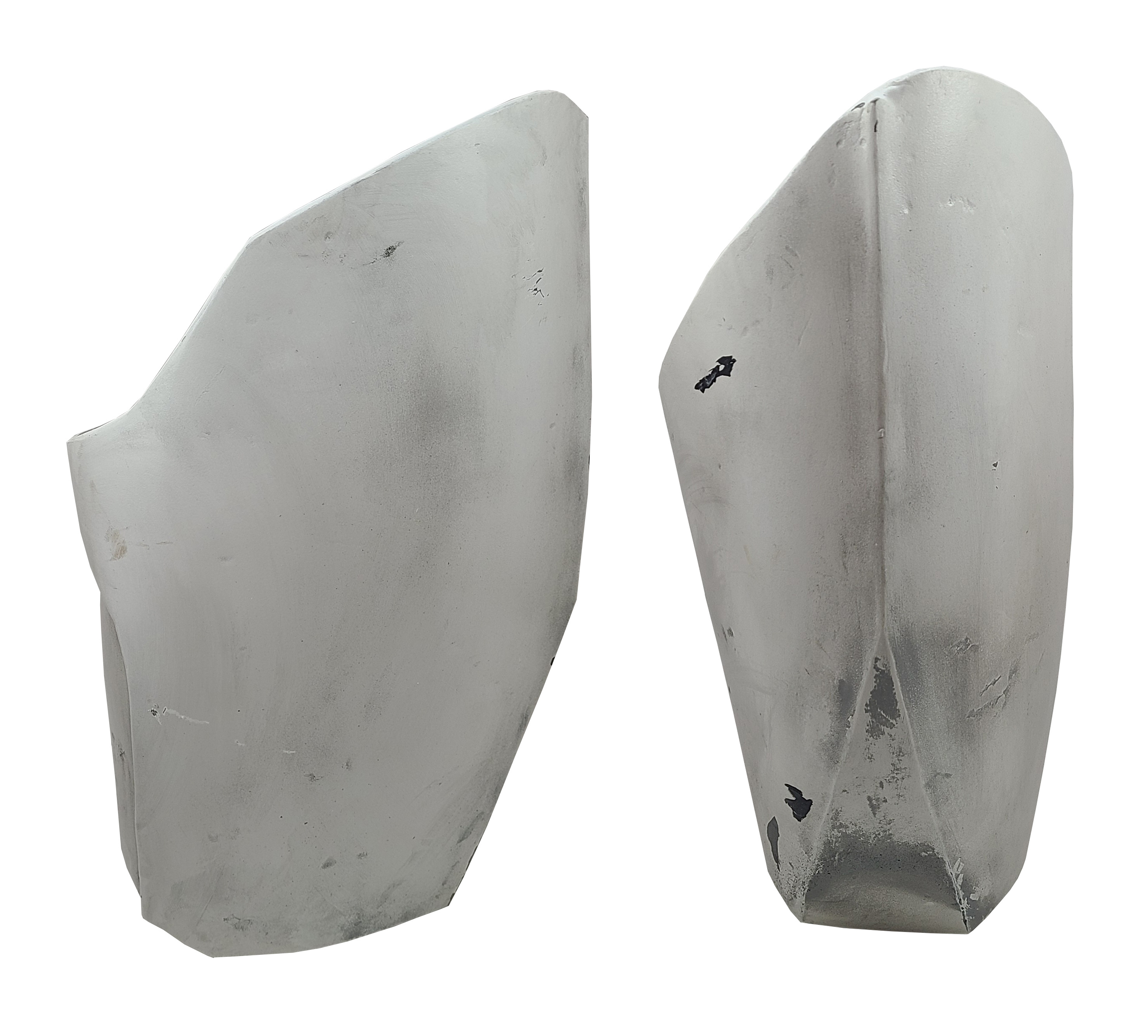 - The front of the armor has a triangular detail at the top of the leg and a hard ridge line down the front of the shin.