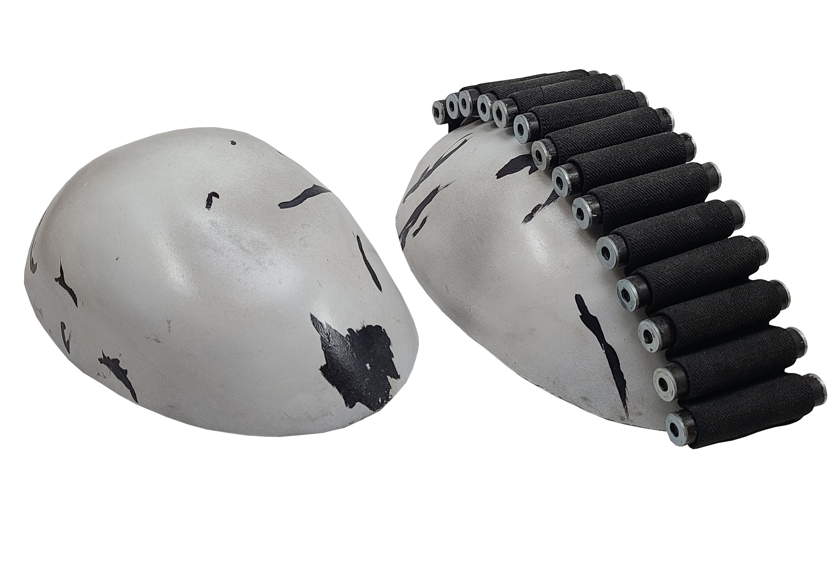- Helmet is weathered with black scuffs similar to reference.