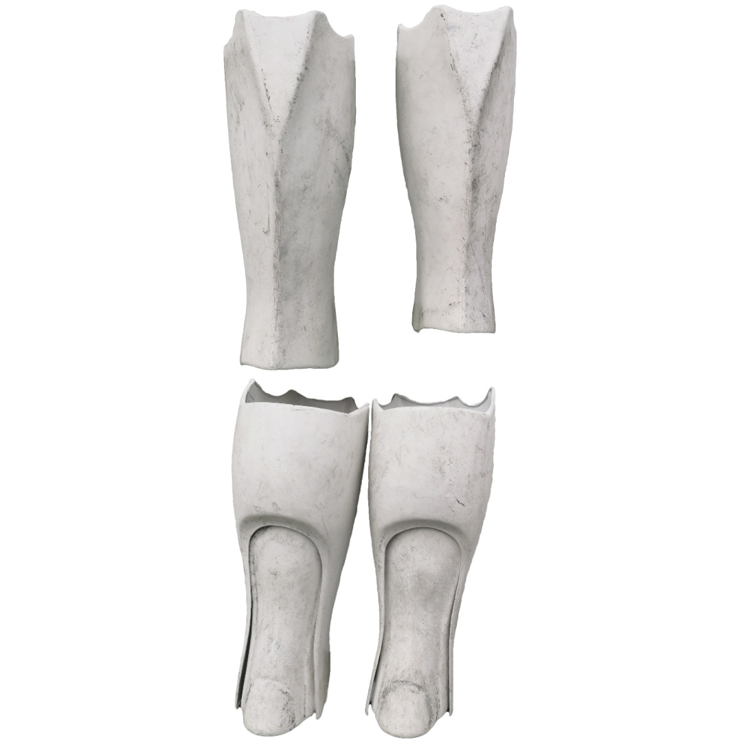 - The front of the armor has a triangular detail at the top of the leg and a hard ridge line down the front of the shin.