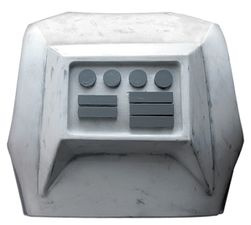 - Right forearm has a compad with (6) small buttons, (1) large main button, and (1) slightly small rectangular button.