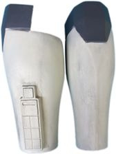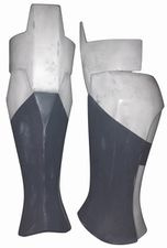 - Front of thigh armor has a flat triangular area near the knee with a notch cut out for the knee armor.