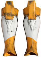 - The front of the armor has a triangular detail just below the knee and a hard ridge line down the front of the shin.