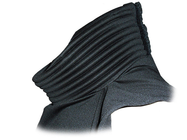 - Black with horizontal ribs, fitted to the wearer, and extending from the base of the neck to conceal the entire neck.