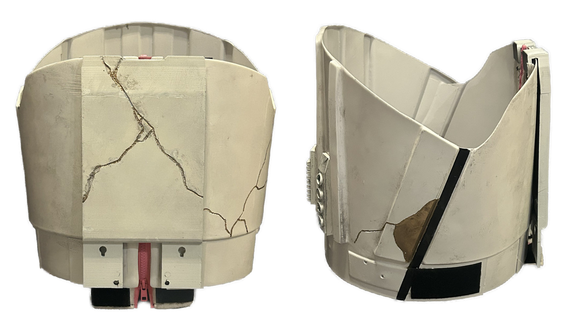- Forearms are loosely held closed in the back with elastic, shock cord (bungee cord) or white Velcro and are designed to remain flexible.