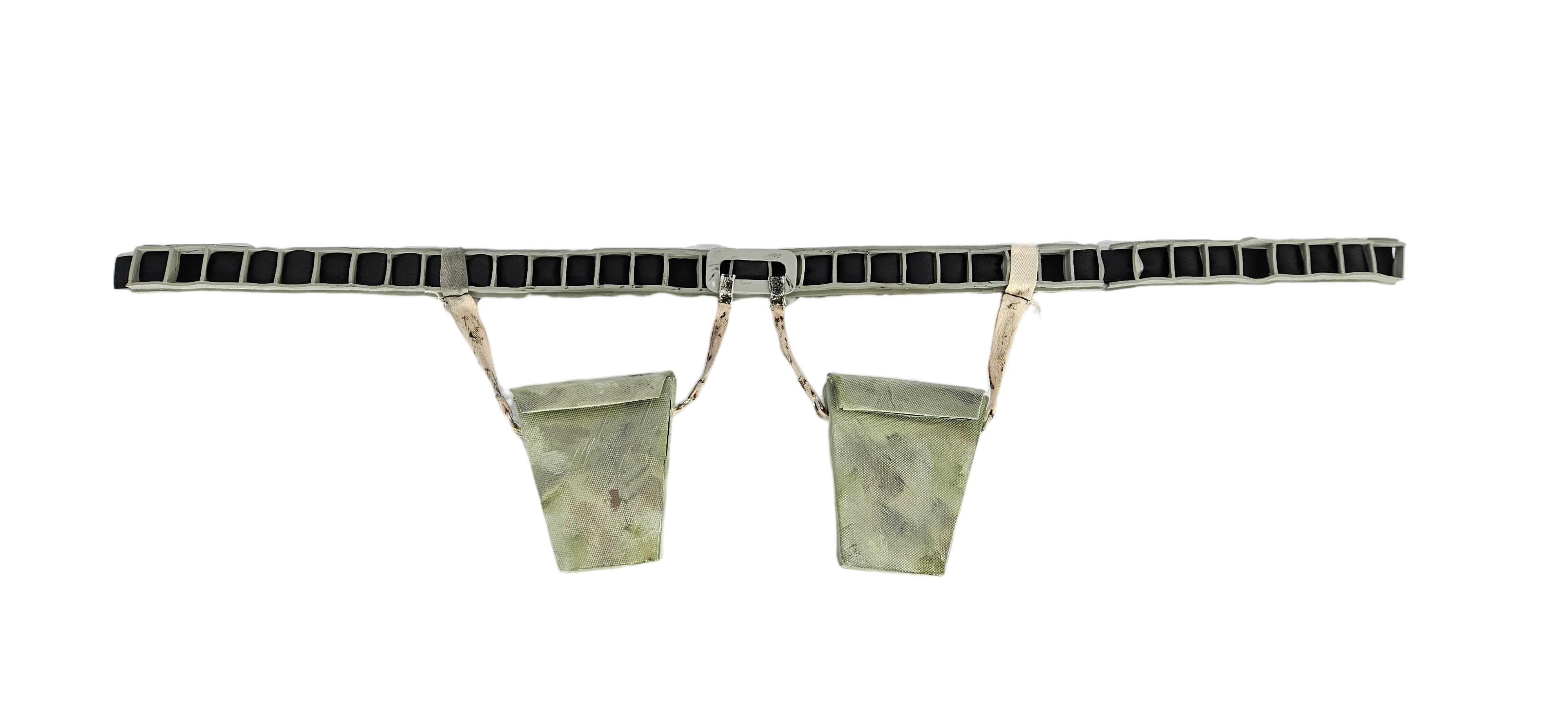 - 2 trapezoid drop boxes hang from belt and belt buckle by 4 tan straps