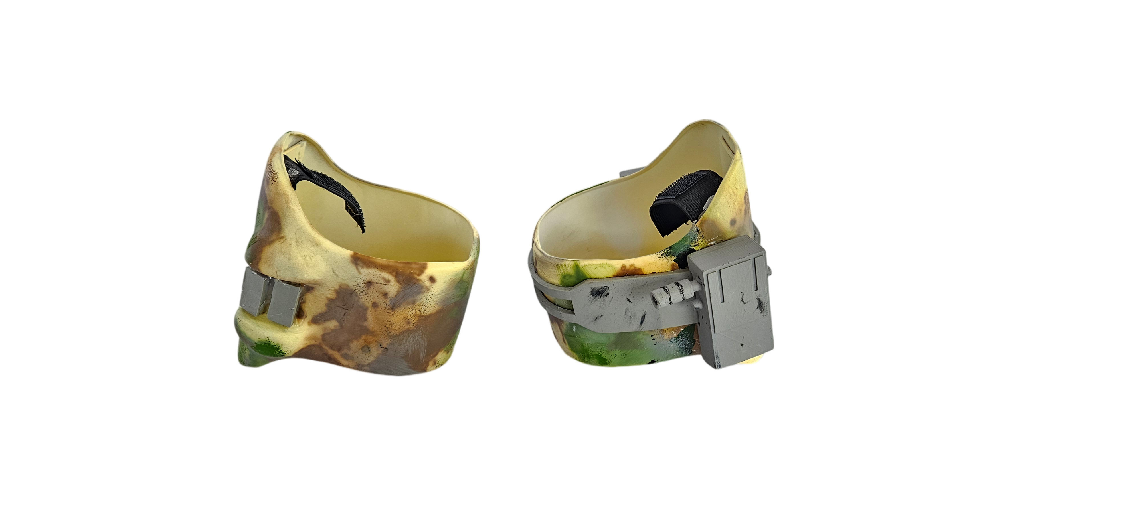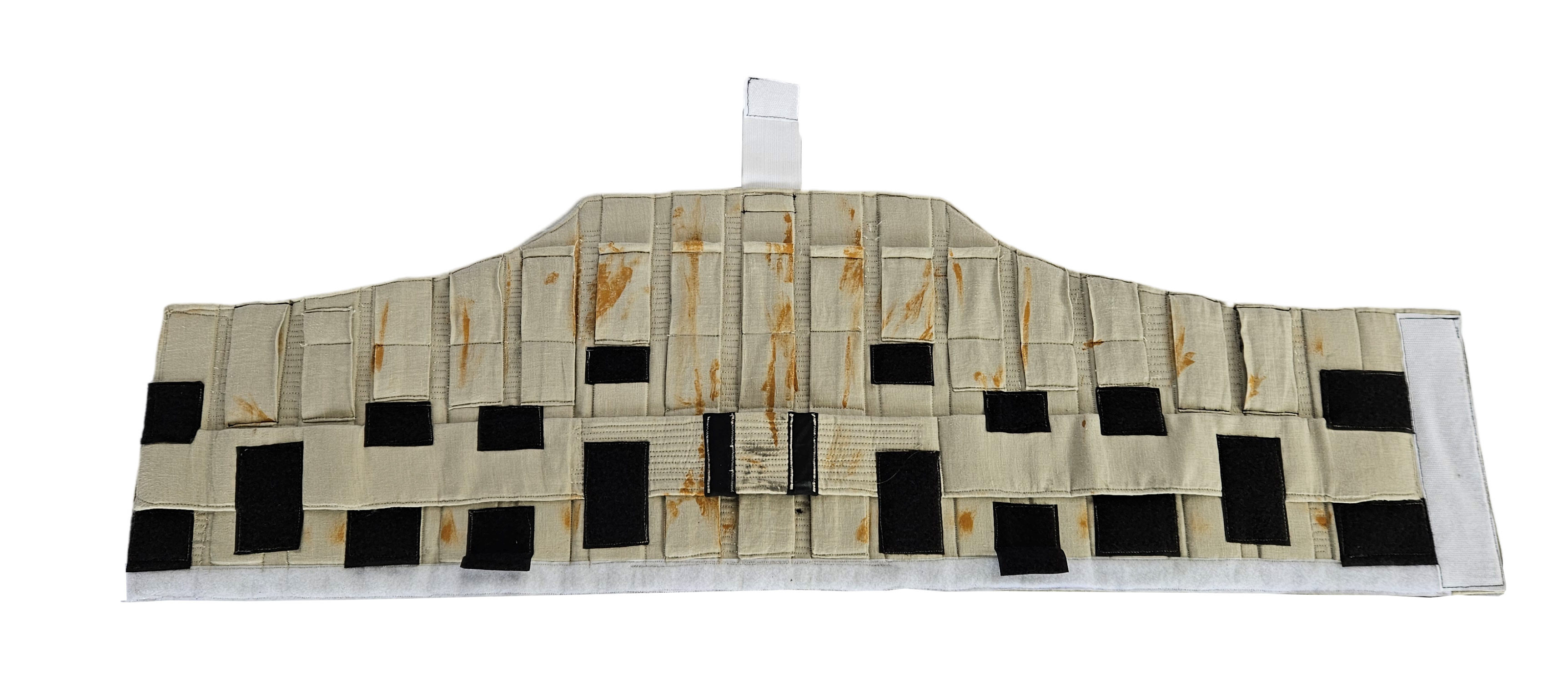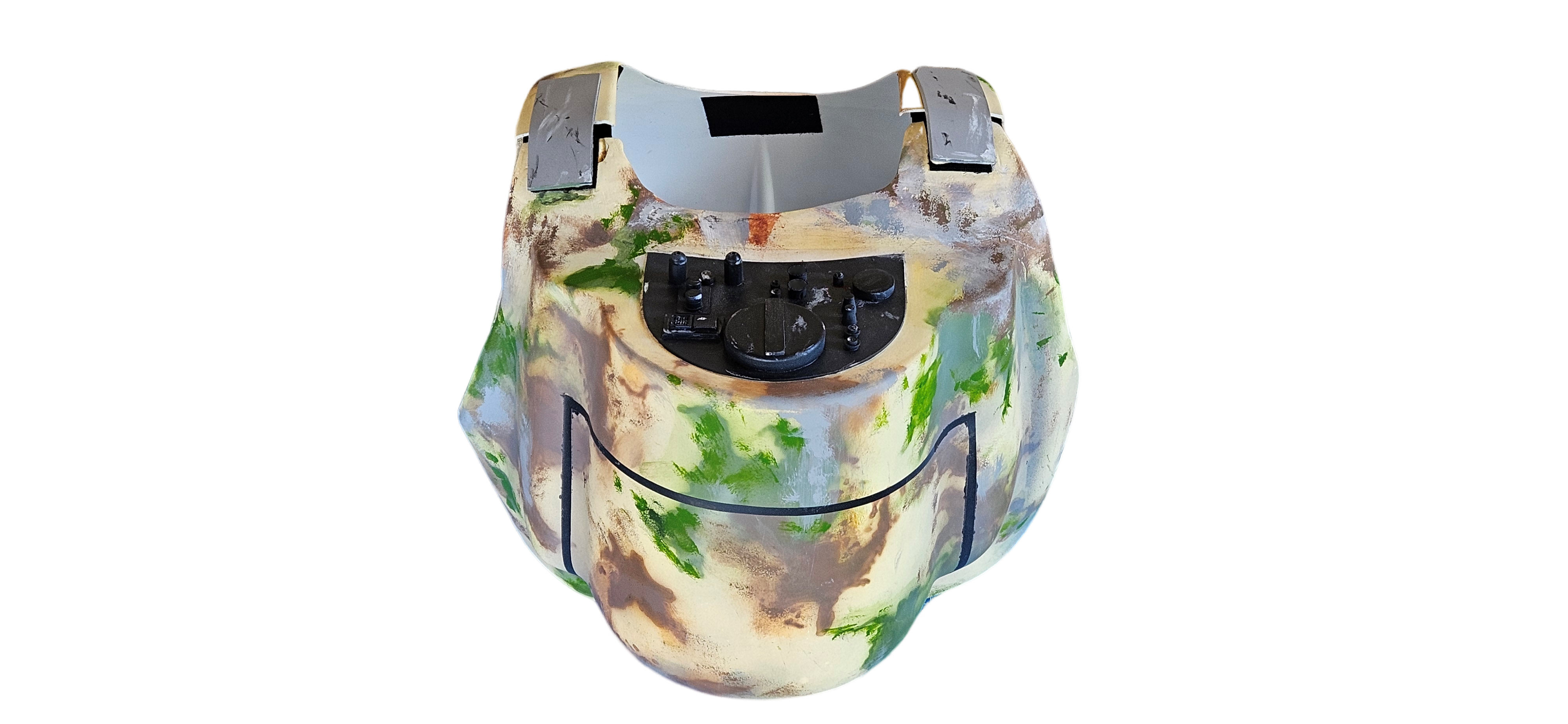 - Cloth-covered and painted with a tan base and camo pattern to match armor