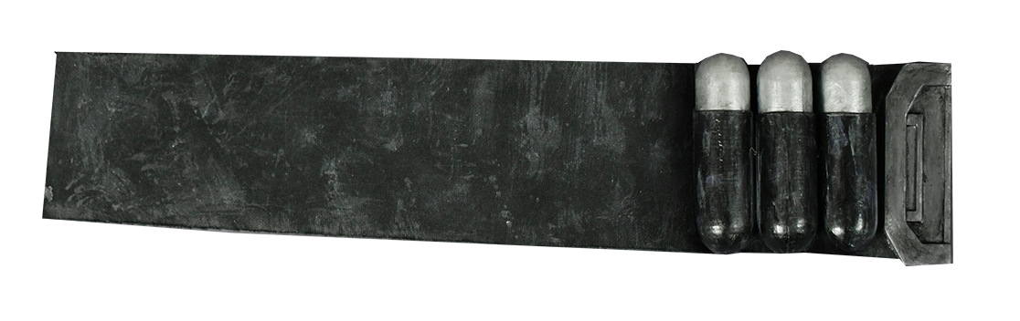 - 3 silver colored tubular containers with spherical ends inside of form fitting black containers sit on the outermost part of the band.