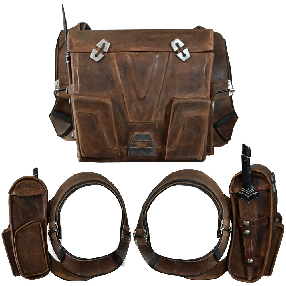 - The backpack consists of a main body with two small angular boxes on the facing front, along with an angled box on the wearers’ right side of the main body and a knife in a sheath with straps and snaps (or similar) attaching it to the wearers’ left side of the main body. Four leather straps (two on each side) come out from behind the center of the main pack body and connect to two shoulder straps that are fitted around the user’s shoulder arm area.