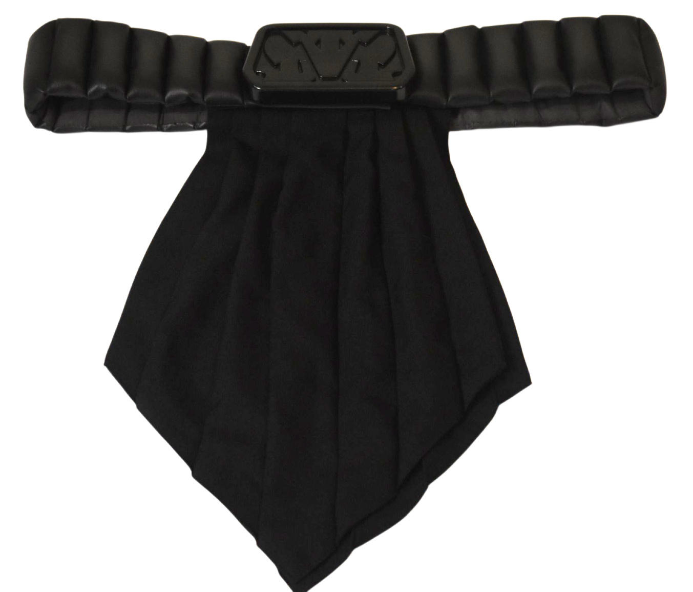 - Attached at the center front and center rear are two (2) panels of black garbadine or similar fabric.